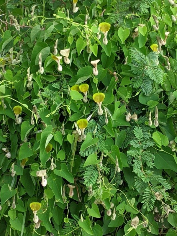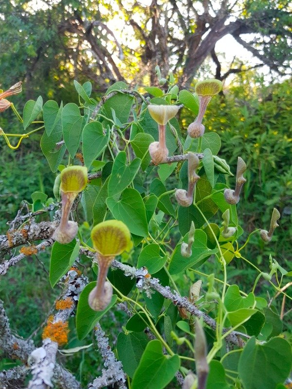 Descripción: Enredadera trepadora perenne, de follaje semicaduco, abundante ramificación y con un aroma muy particular. Sus hojas tienen forma de corazón. Es planta hospedera de la mariposa “Borde de oro” (Battus polydamas). Sin espinas.